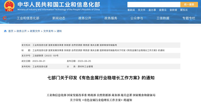 工業(yè)和信息化部、國(guó)家發(fā)展改革委、財(cái)政部、自然資源部、商務(wù)部、海關(guān)總署、國(guó)家糧食和儲(chǔ)備局等七部門(mén)日前聯(lián)合印發(fā)《有色金屬行業(yè)穩(wěn)增長(zhǎng)工作方案》(實(shí)施期限為2023-2024年)。主要涉礦內(nèi)容有:一是加快戰(zhàn)略資源開(kāi)發(fā)利用。針對(duì)銅、鋁、鎳、鋰、鉑族金屬等緊缺戰(zhàn)略性礦產(chǎn),加大國(guó)內(nèi)勘查開(kāi)發(fā)力度,制訂鋰等重點(diǎn)資源開(kāi)發(fā)和產(chǎn)業(yè)發(fā)展總體方案。二是搭建上下游供需對(duì)接平臺(tái),引導(dǎo)有色金屬資源開(kāi)發(fā)和冶煉企業(yè)與下游用戶(hù)簽訂長(zhǎng)期采購(gòu)協(xié)議,穩(wěn)定銅、鋁、鋰等關(guān)鍵產(chǎn)品供應(yīng),科學(xué)調(diào)控稀土、鎢等礦產(chǎn)資源開(kāi)發(fā)利用規(guī)模,有效保障國(guó)內(nèi)市場(chǎng)供應(yīng)。三是培育銅、鋰、鎳、鎢、銻等重要有色金屬產(chǎn)業(yè)鏈“鏈主”企業(yè),從資源配置、品牌價(jià)值、創(chuàng)新能力、國(guó)際化程度等方面與世界一流企業(yè)對(duì)標(biāo)對(duì)表,提升企業(yè)綜合競(jìng)爭(zhēng)力。四是鼓勵(lì)進(jìn)口初級(jí)產(chǎn)品。支持冶煉企業(yè)與國(guó)外礦企簽訂長(zhǎng)期采購(gòu)協(xié)議,加大銅精礦、鋁土礦、鎳精礦、鋰精礦、鈷中間冶煉品等原料進(jìn)口力度。