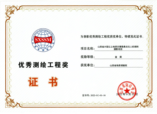 地調(diào)院有限公司測繪地理信息技術(shù)研究院承擔(dān)的《山西省大型以上地質(zhì)災(zāi)害隱患點(diǎn)無人機(jī)傾斜攝影》項(xiàng)目獲得2022年度優(yōu)秀測繪工程獎(jiǎng)金獎(jiǎng)。